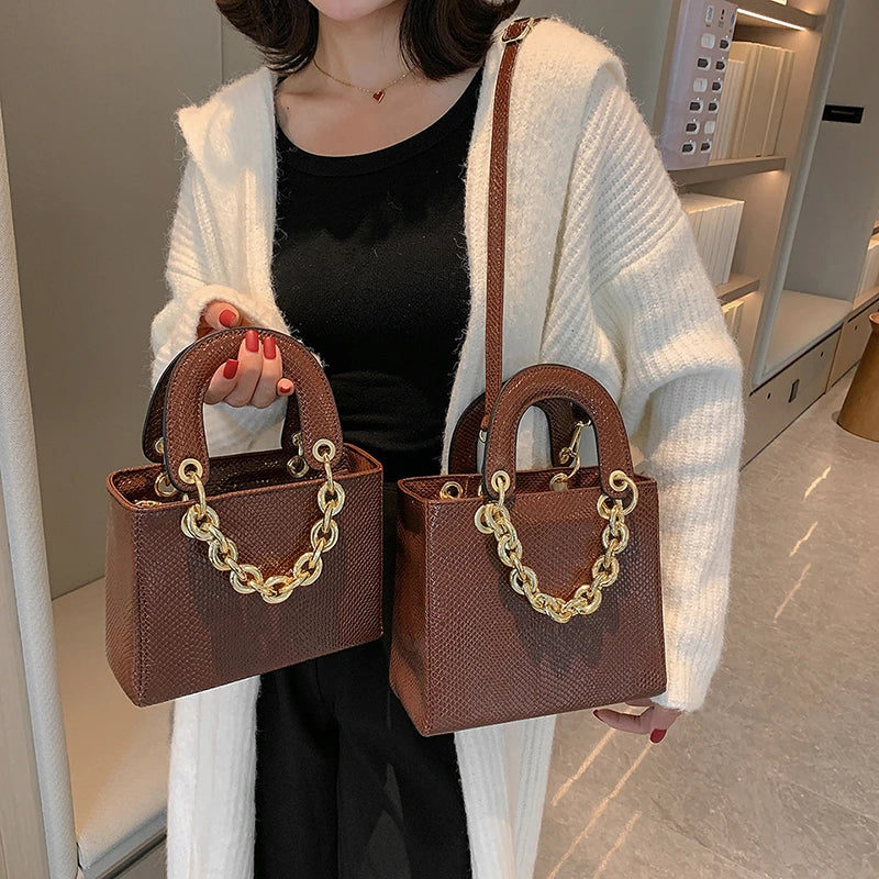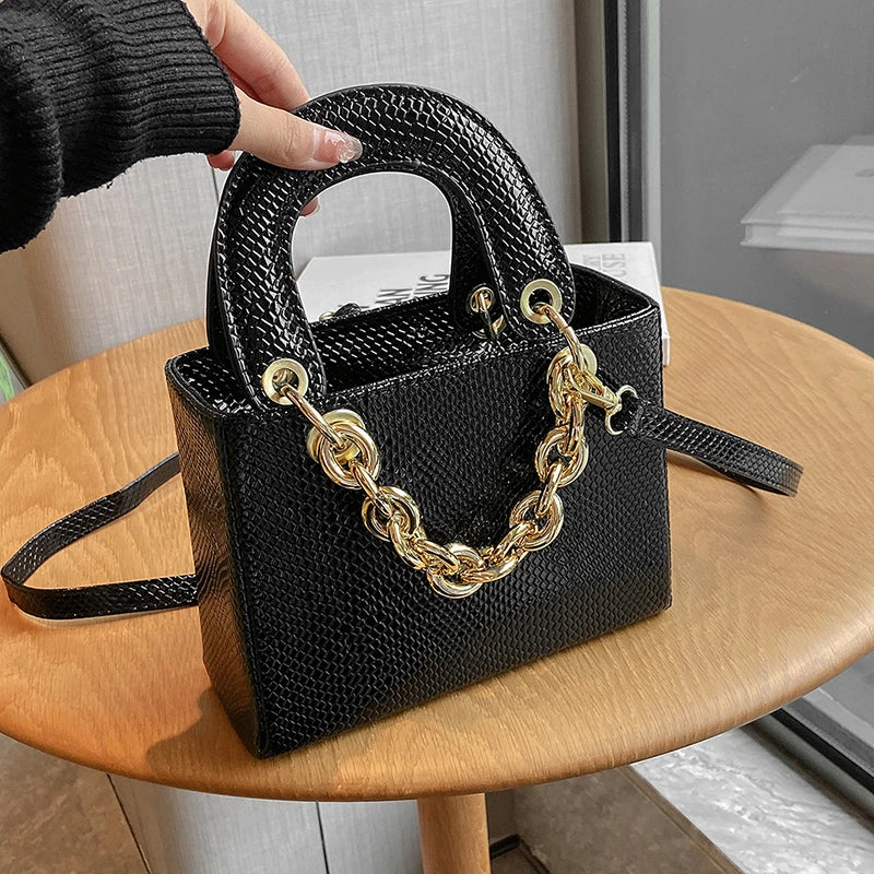 Stay stylish with this trendy shoulder bag featuring a thick metal chain strap. Perfect for carrying essentials on the go.