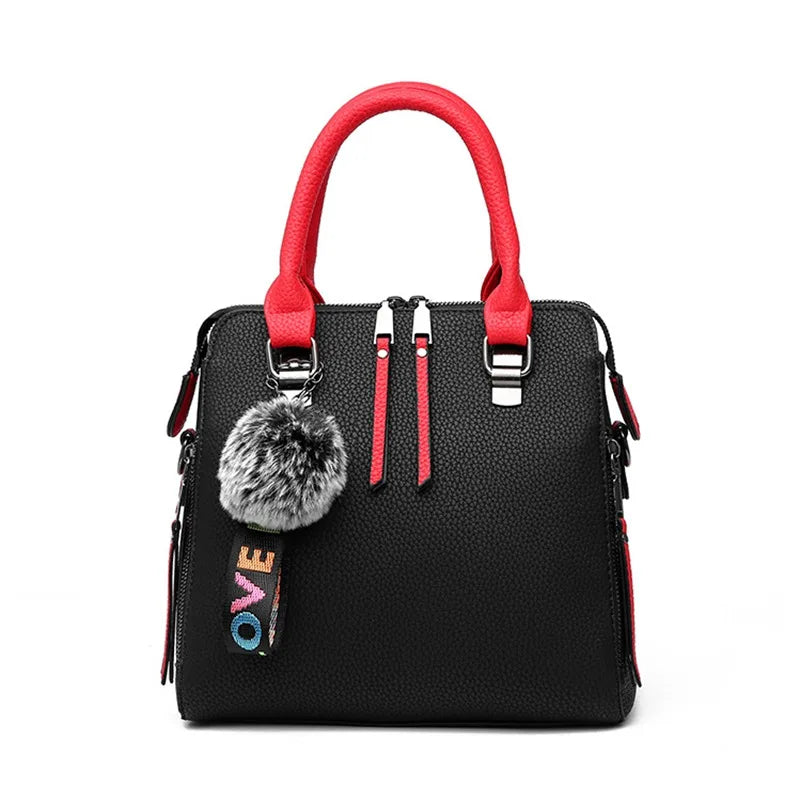 This Leaher handbag is a stylish and functional addition to your accessories. It features a fur ball decoration for a trendy touch.
