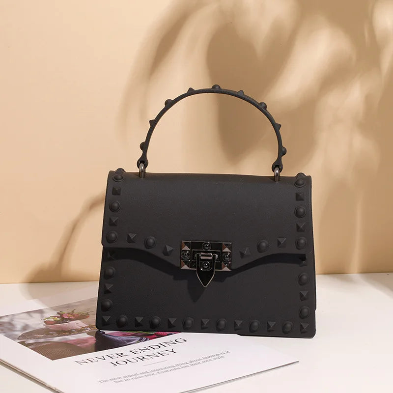 This shoulder bag is made of high-quality PVC material with a matte finish. It features a flap with hasp closure and stylish rivets. Perfect for everyday use, this satchel bag can also be worn as a crossbody bag.