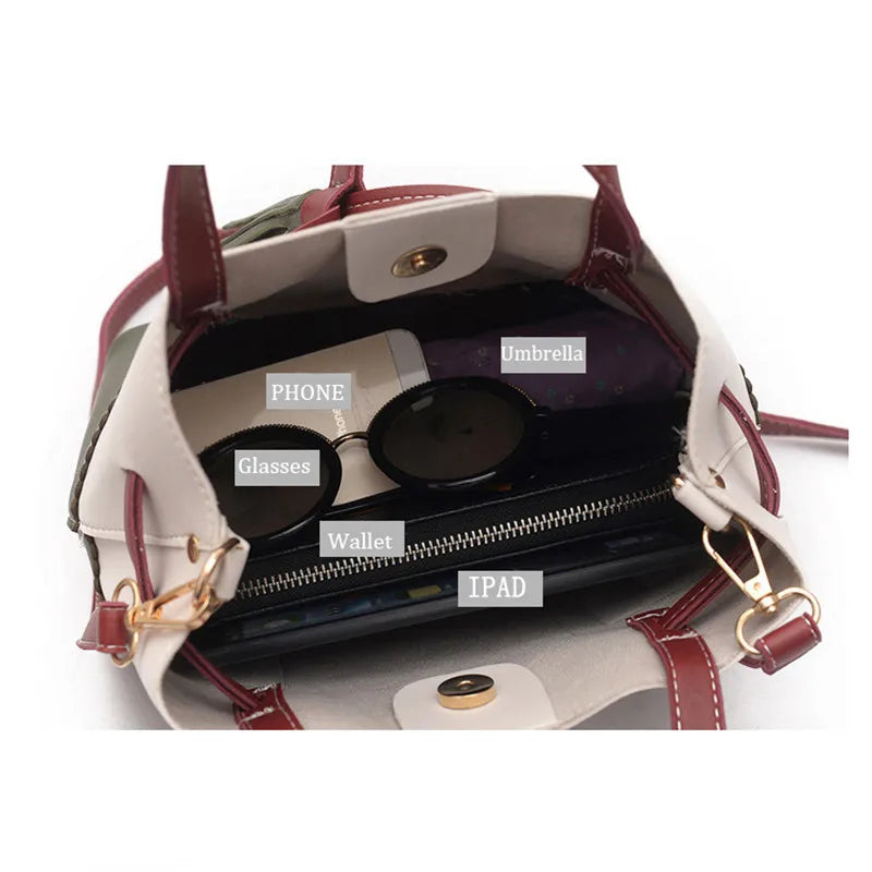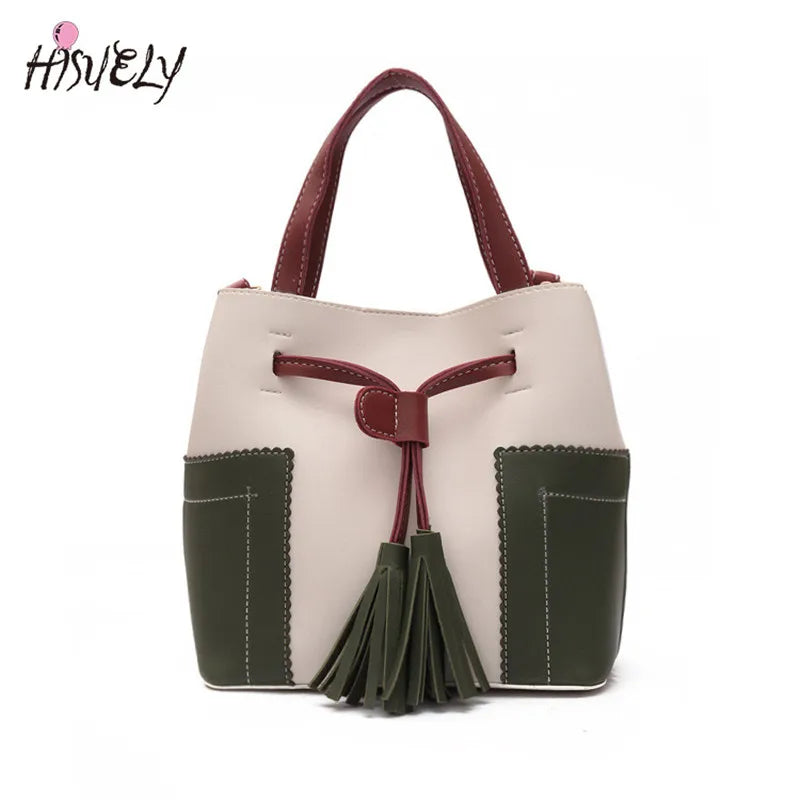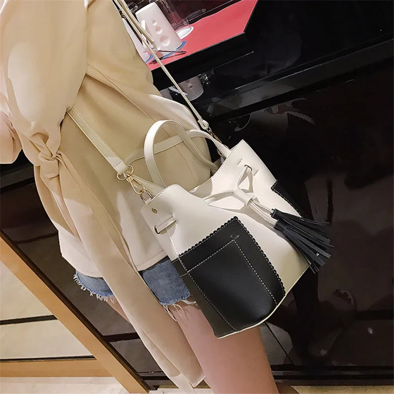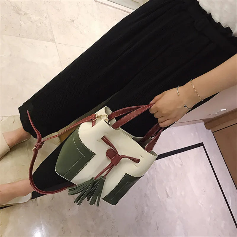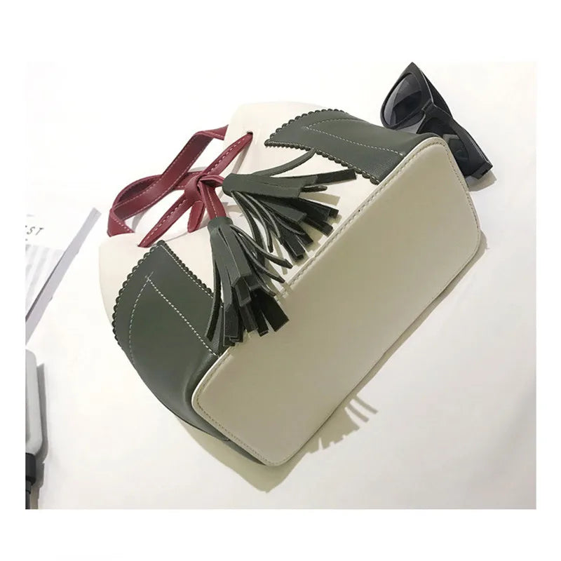 Spliced PU Leather Handbag Tassel Bucket Vintage Shoulder Bag