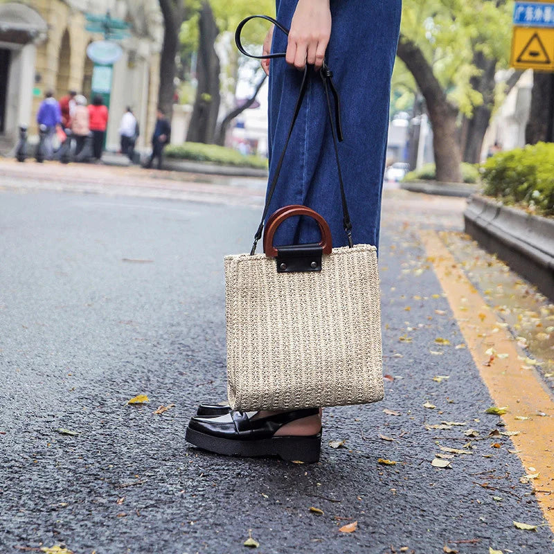 Straw Woven Beach Bag Wooden Handle Shoulder Messenger Resort Style Handbag