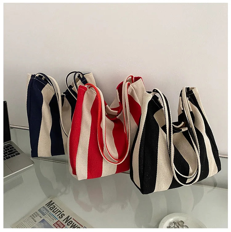 Striped Canvas Shoulder Bag Vintage Style Large Capacity Retro Handbag