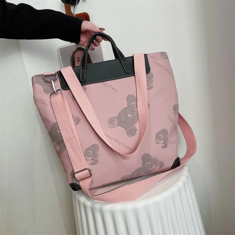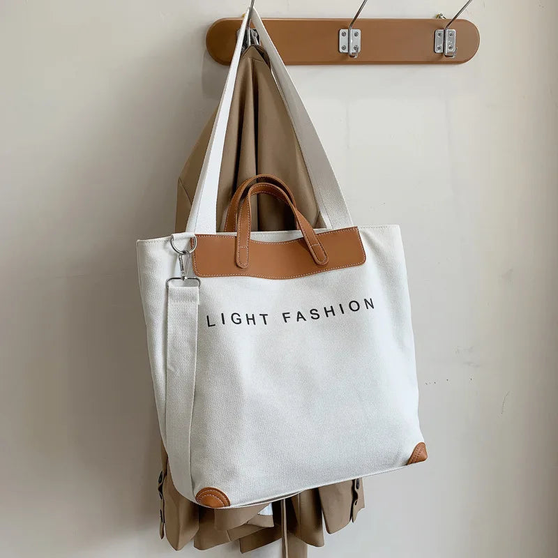 Stay stylish with this spacious tote bag that features a wide canvas shoulder strap and chic letter design. Perfect for carrying all your essentials in a fashionable way.