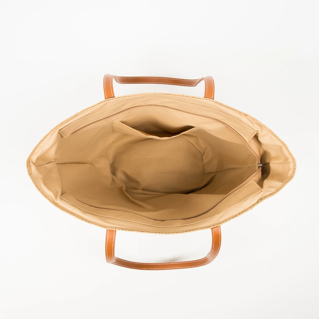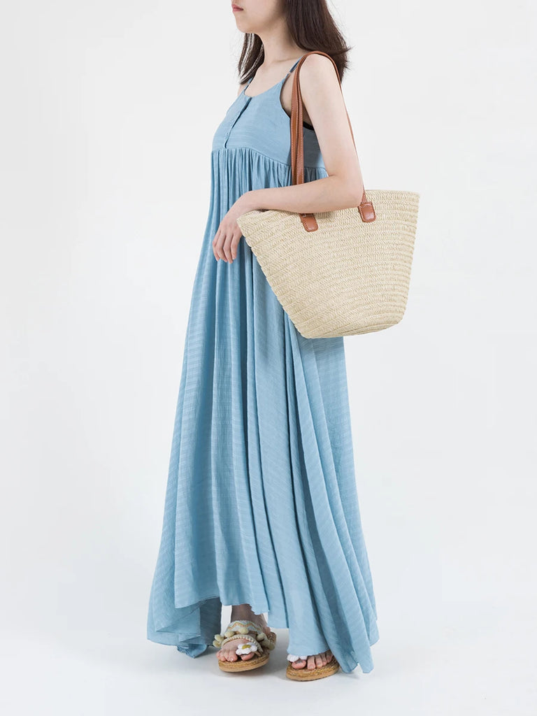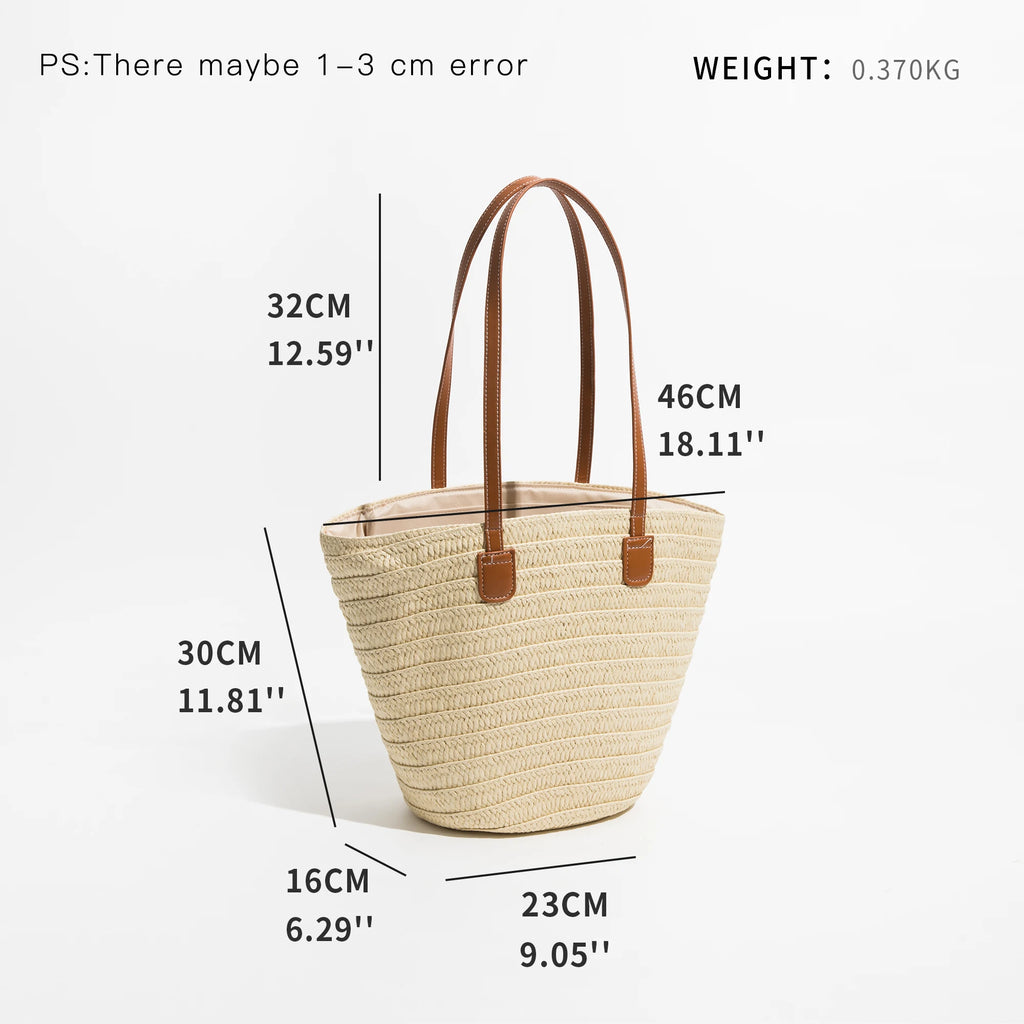 Stay stylish on the beach with this fan-shaped straw beach bag. It offers a large capacity for all your essentials and can be worn as a shoulder or hobo purse.