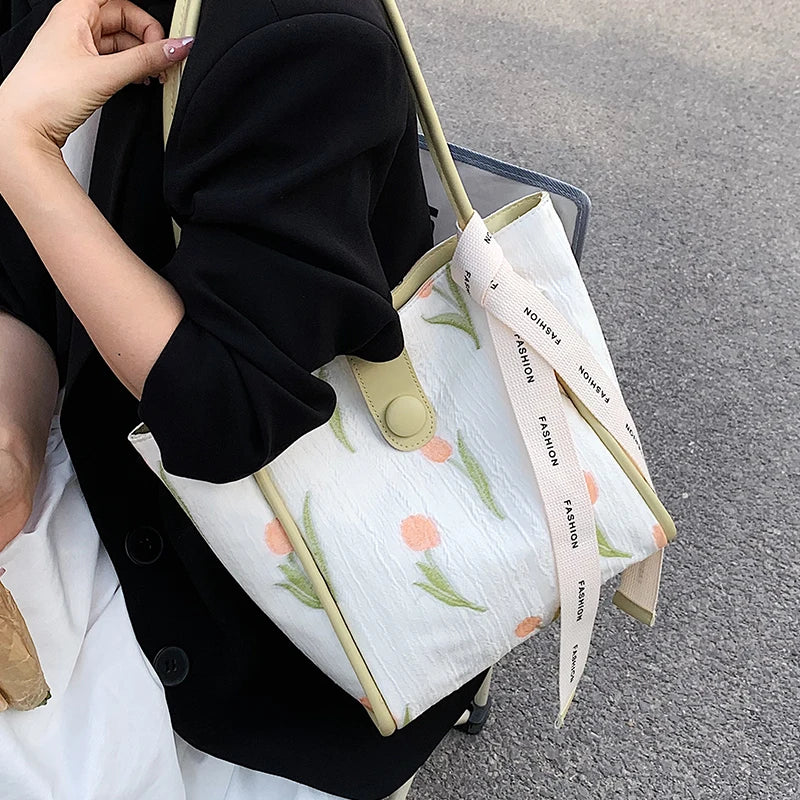 Stay in style with this large-capacity tote bag featuring a beautiful floral design. Perfect for everyday use or as a commuter handbag.