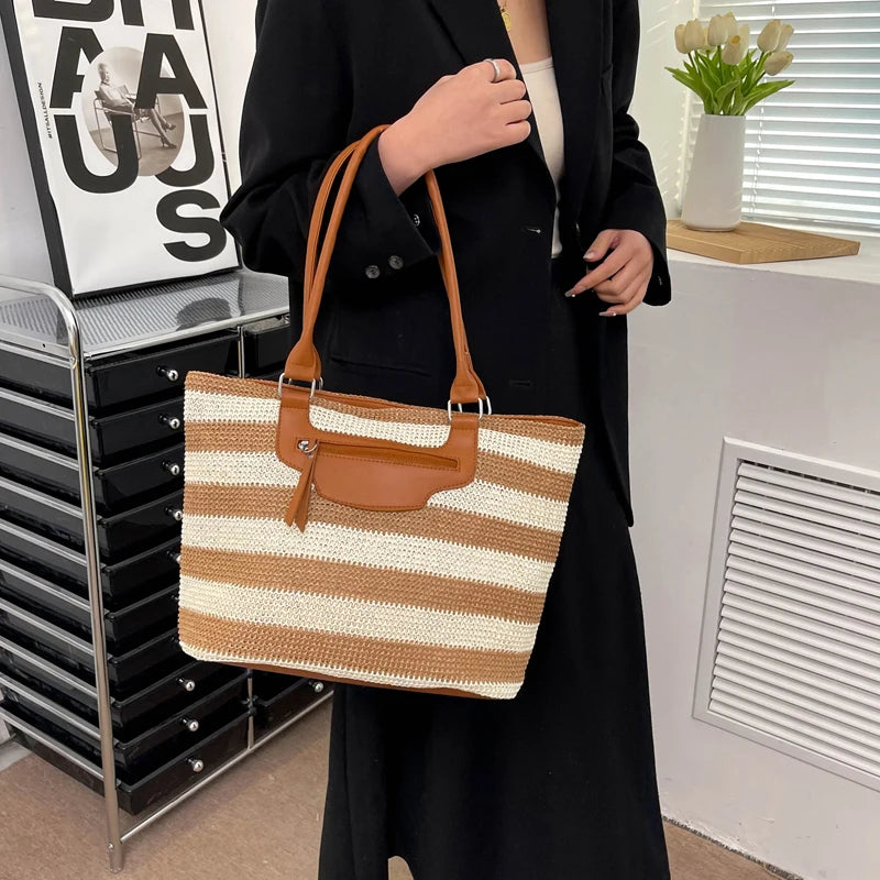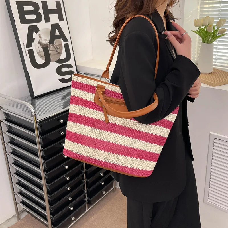 Summer Striped Shoulder Bag Big Beach Casual Straw Bag Ladies Tote