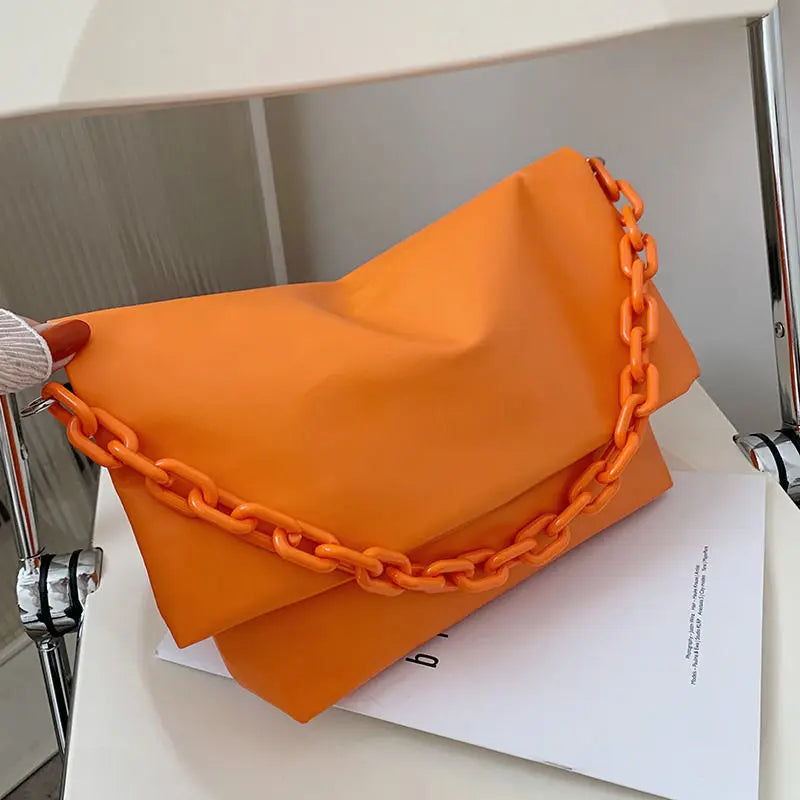 Stay trendy this summer with these stylish tote bags that feature an acrylic chain design. The orange shoulder bag is made from soft leather and comes with a pink pouch for added convenience.