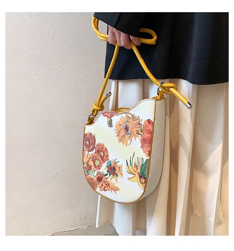 This underarm bag features a summer floral design inspired by sunflower oil painting. Perfect for ladies who love a sweet cherry touch. Ideal for carrying your essentials in style.