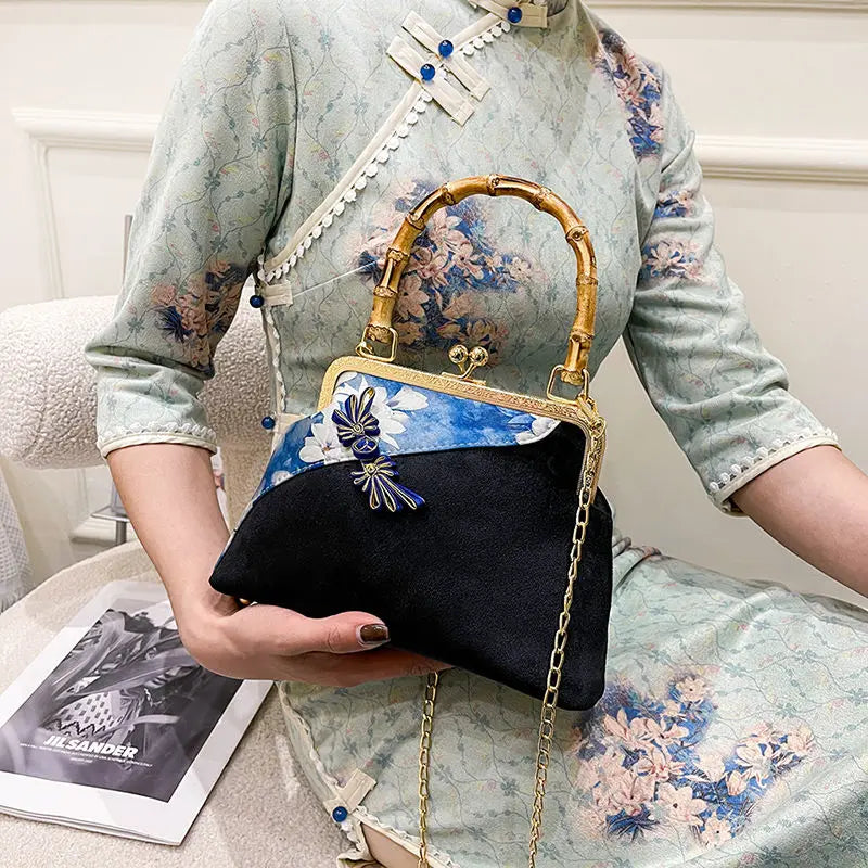 This retro cheongsam shoulder bag features a unique wood tote design with a lock shell accent. Perfect for adding a classy touch to your outfit.