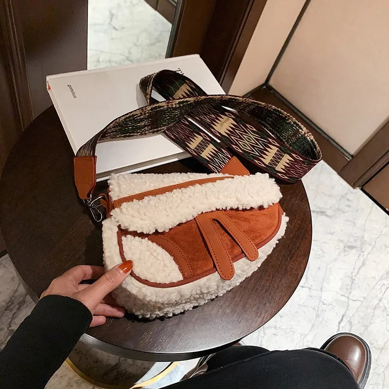 Vintage Cashmere Saddle Handbag Women Shoulder Crossbody Bag