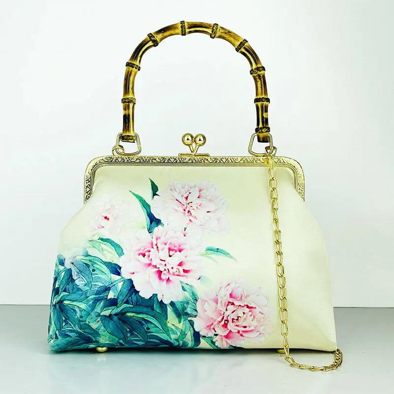 This women's handbag features a flower lock design with a chain shoulder strap. It has a vintage aesthetic and is perfect for everyday use.