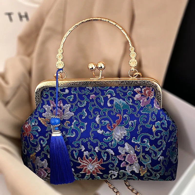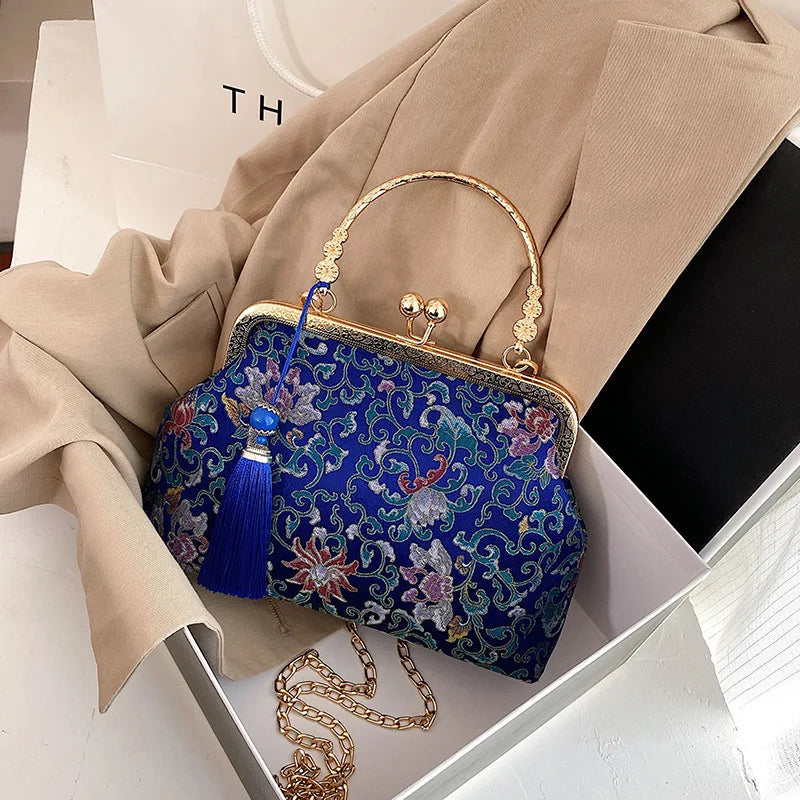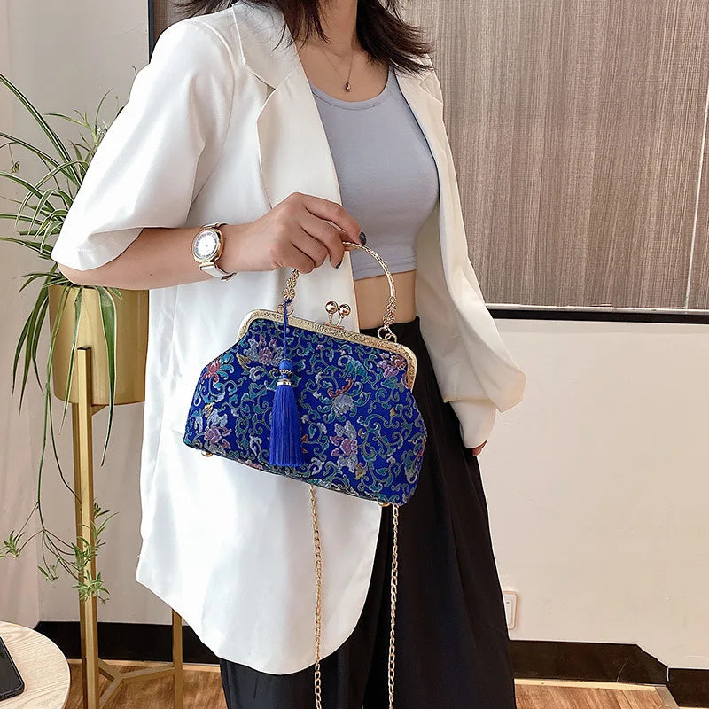 This retro vintage bag features a stylish fringe tassel design with a shell lock closure. It makes for a perfect gift for mothers and comes with a chain strap for versatile wearing options. Ideal for carrying daily essentials in style.