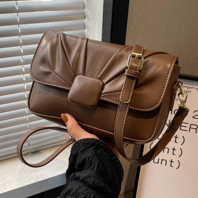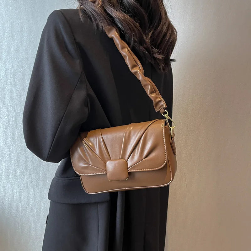 Vintage High Handbag Women Square Lock Shoulder Bag Ruched Strap Messenger
