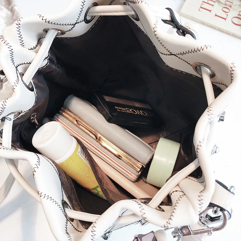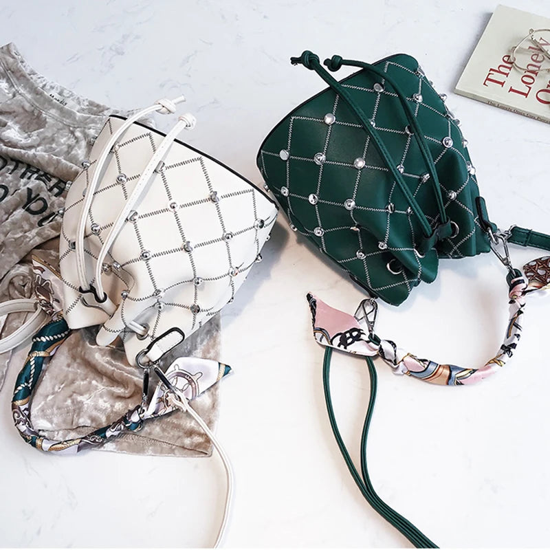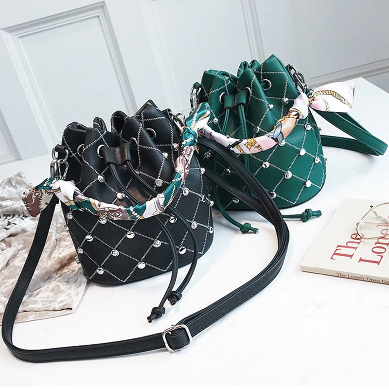 This high-quality women's shoulder bag features a drawstring closure with a silk ribbon accent. The bucket style bag is adorned with rivets and has a solid vintage design, making it a stylish choice for any outfit.