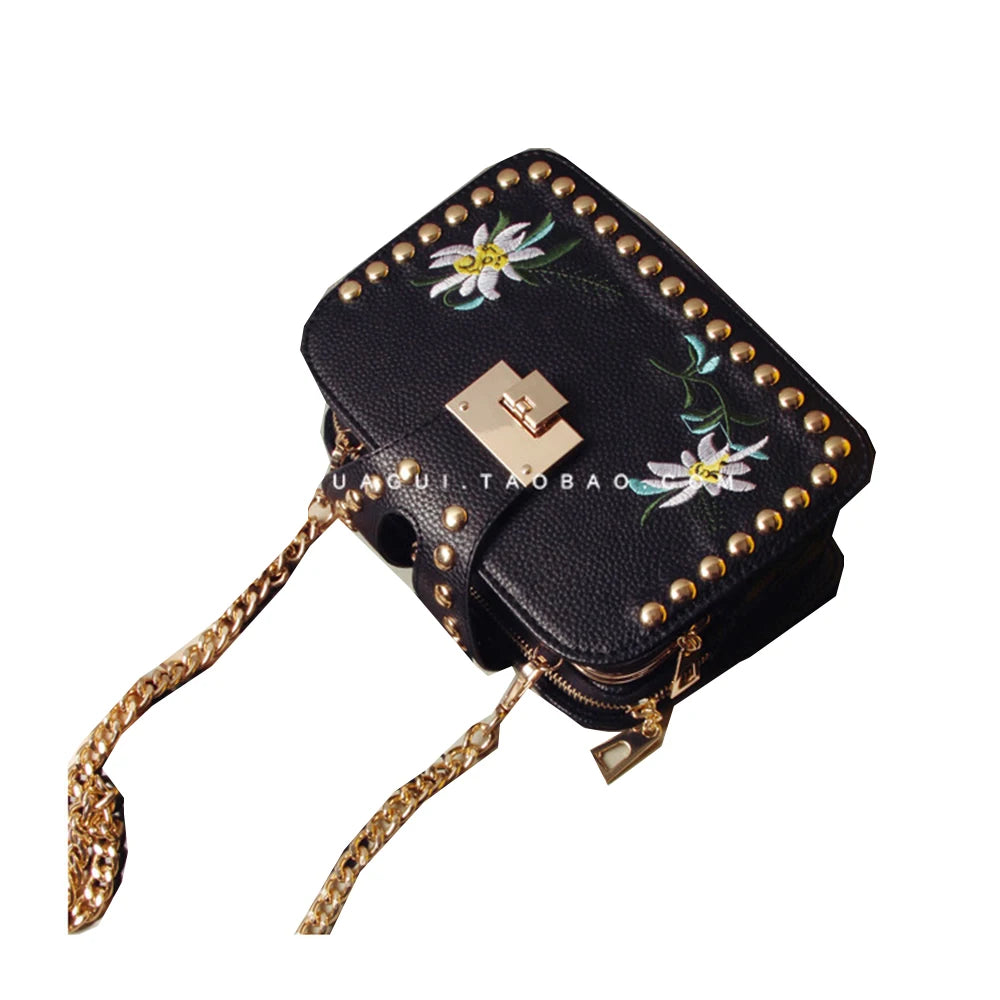 This retro embroidery women's bag features a classic design with rivet accents and a famous pattern. It can be worn as a shoulder bag or crossbody bag, making it versatile for any occasion.