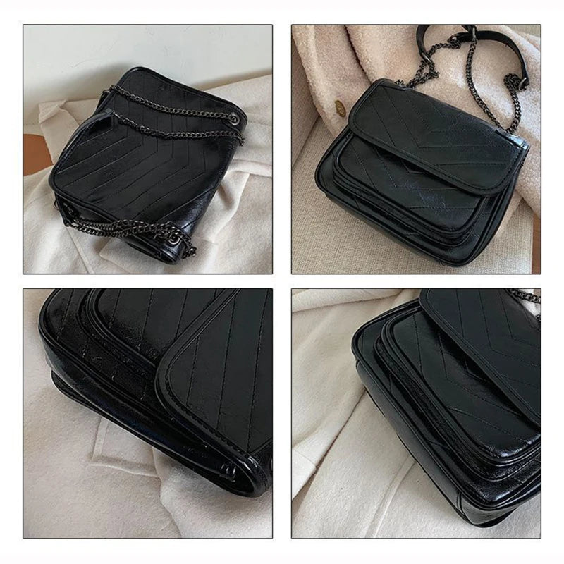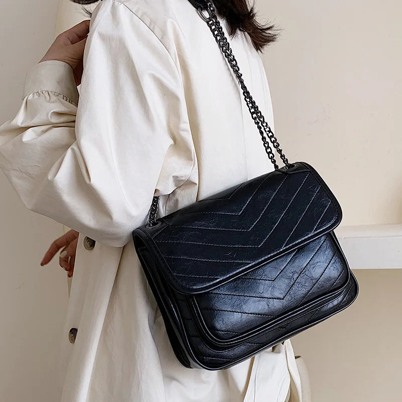 This stylish shoulder bag is made of high-quality oil PU leather with a vintage stripe design. It features a flap closure and a chain strap for a chic look.