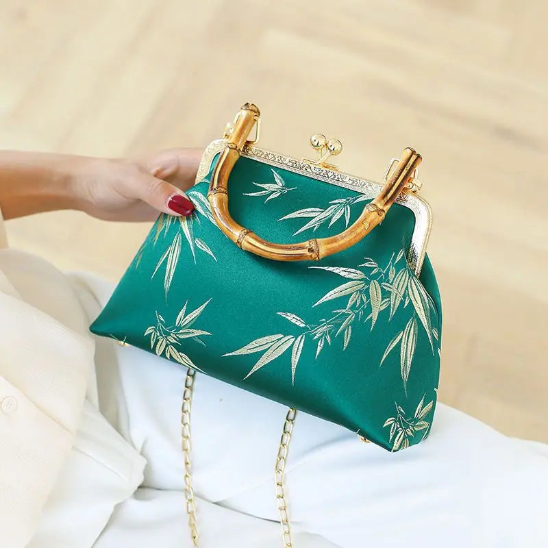 This vintage-inspired handbag features a unique wooden design with a chain strap, perfect for adding a touch of retro flair to any outfit.