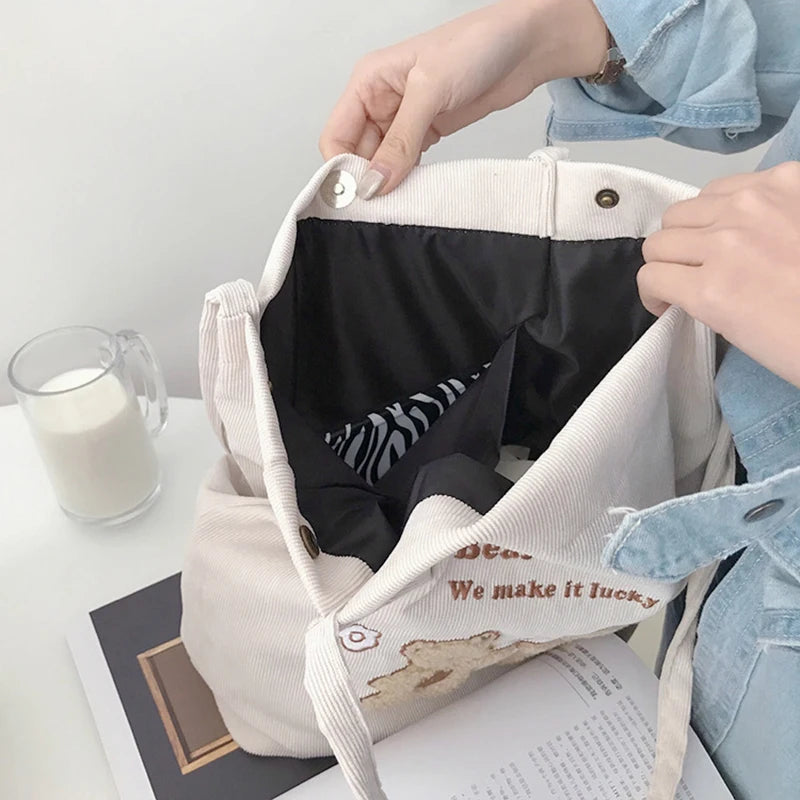 Stay stylish with this literary embroidery corduroy shoulder bag featuring a winter bear design. Perfect for shopping or carrying books, this handbag is ideal for girls.