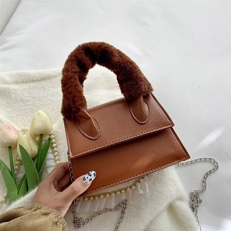 Stay stylish and cozy this winter with this PU leather handbag featuring a plush handle. Perfect for carrying your essentials while adding a touch of elegance to your outfit.