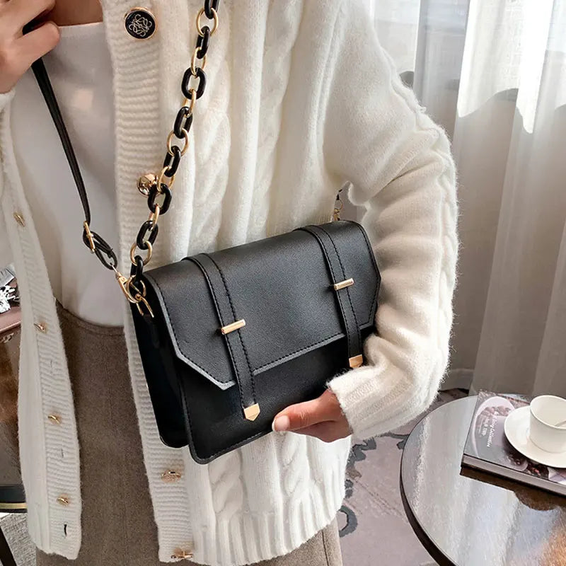Stay stylish with this PU leather handbag that's perfect for casual outings. It features a chain strap and a square design, making it a trendy addition to your wardrobe.