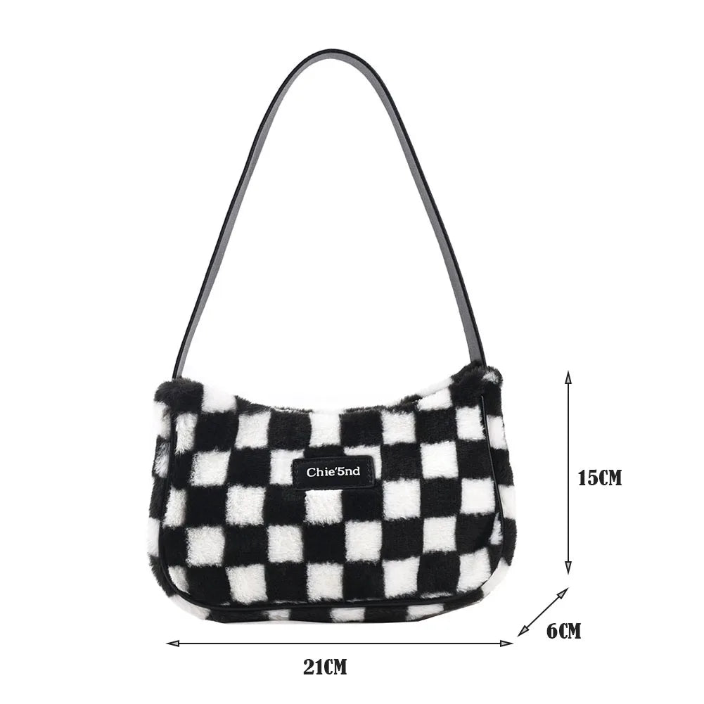 Winter Checker Print Shoulder Bag Women Plush Underarm Bags Casual Female Tote