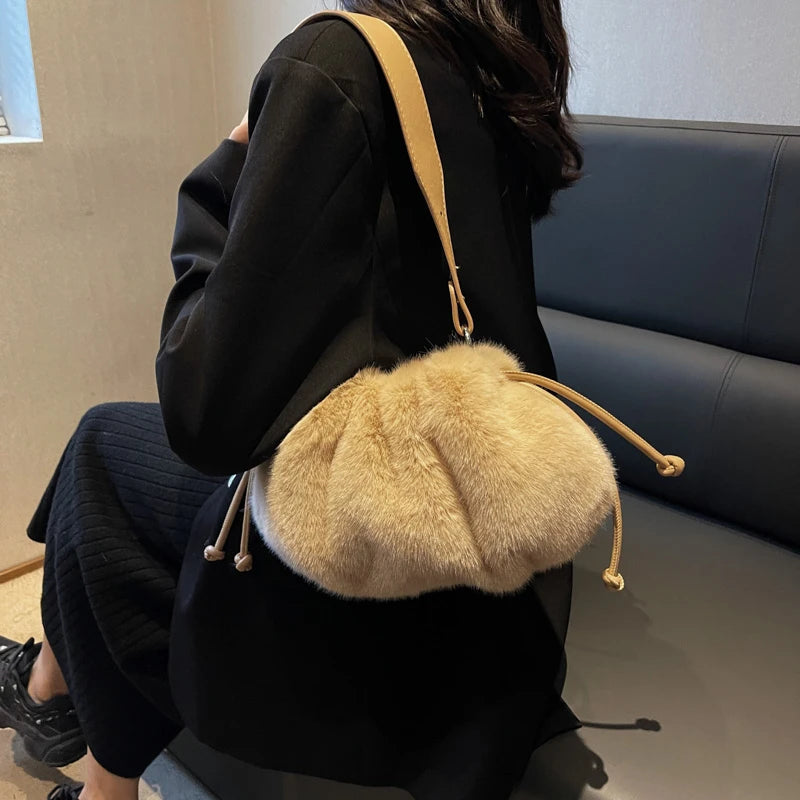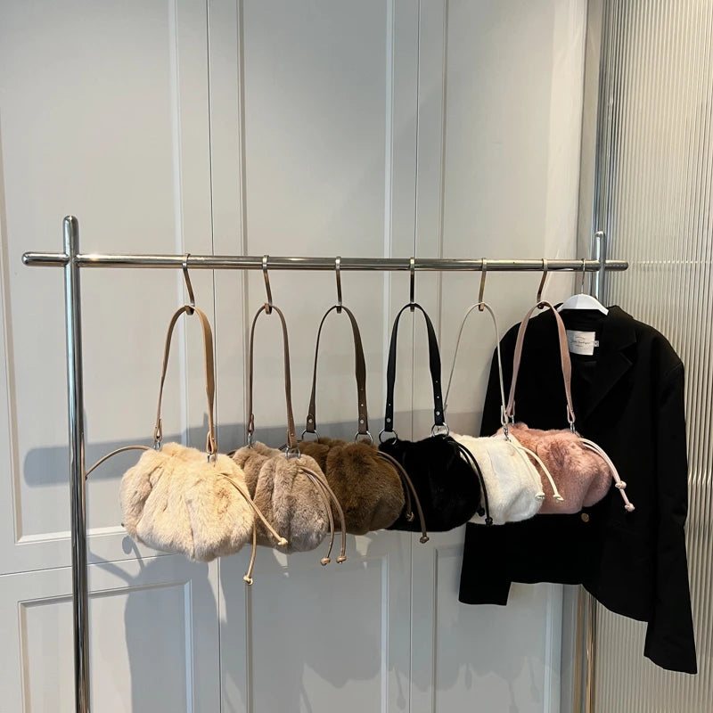 Stay cozy and stylish with this small bucket shoulder bag featuring faux fur. Perfect for winter fashion. Available in a variety of lovely colors.