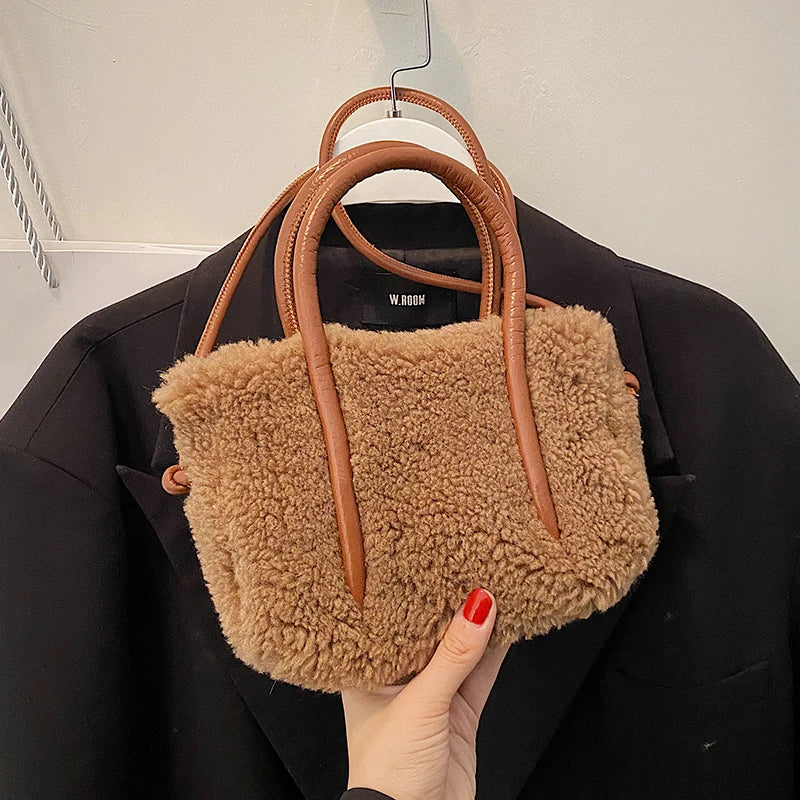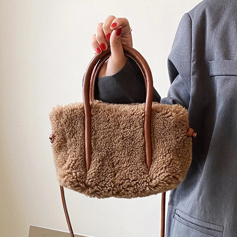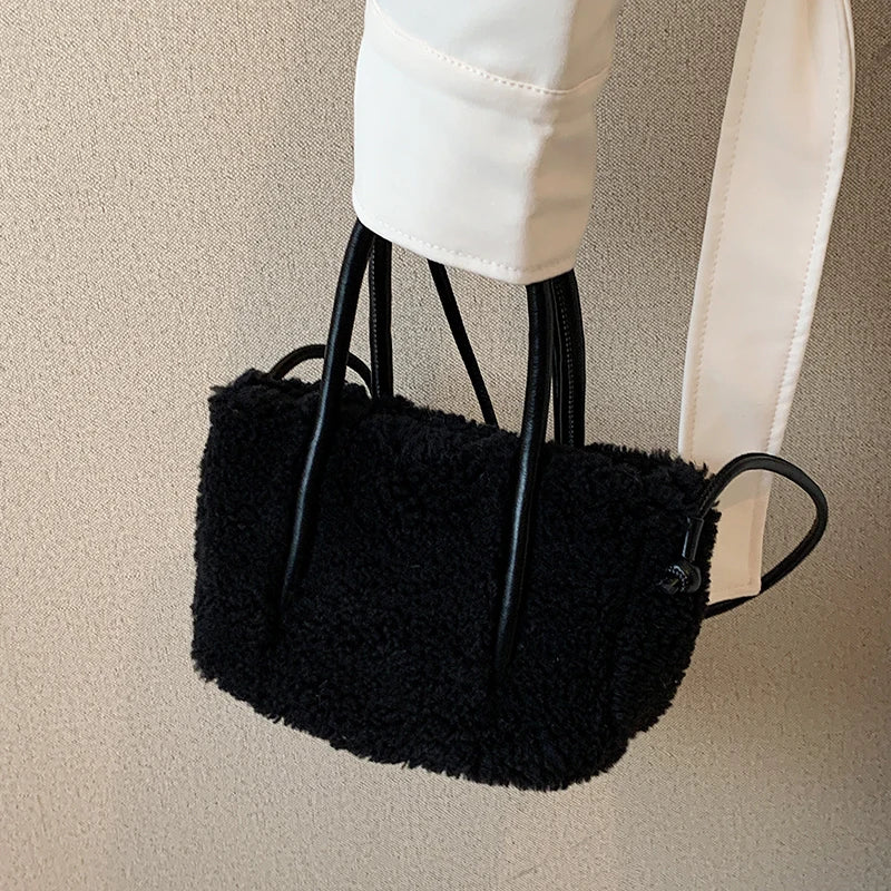 Stay cozy and stylish this winter with this soft plush tote bag made of lamb fleece. Perfect for daily use with its spacious design and comfortable feel.