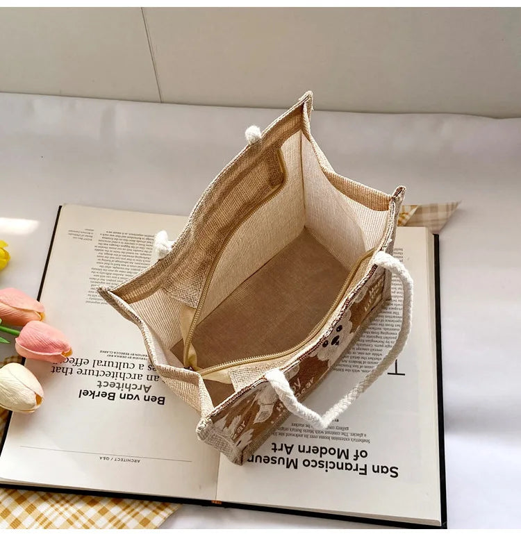 Women Canvas Shoulder Bag Bear Linen Print Casual Handbag Tote Bag