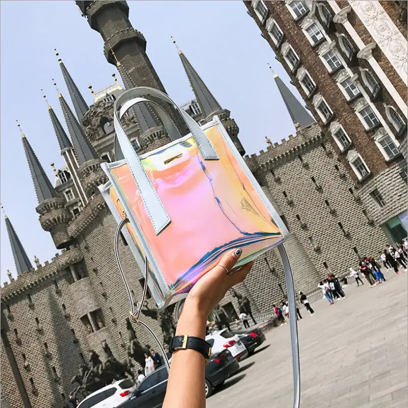 This trendy holographic laser messenger bag is perfect for women who want to make a statement. The transparent design with rainbow hologram detailing adds a unique touch to any outfit.