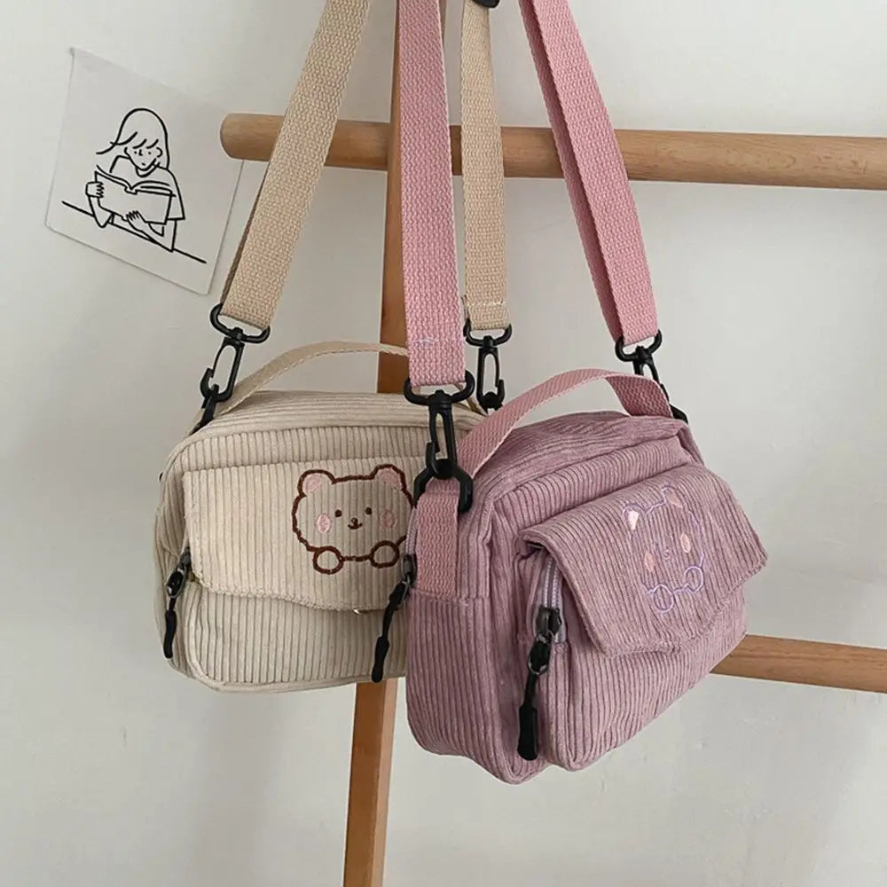 Women Corduroy Bear Print Shoulder Bag Student Tote Messenger Satchel