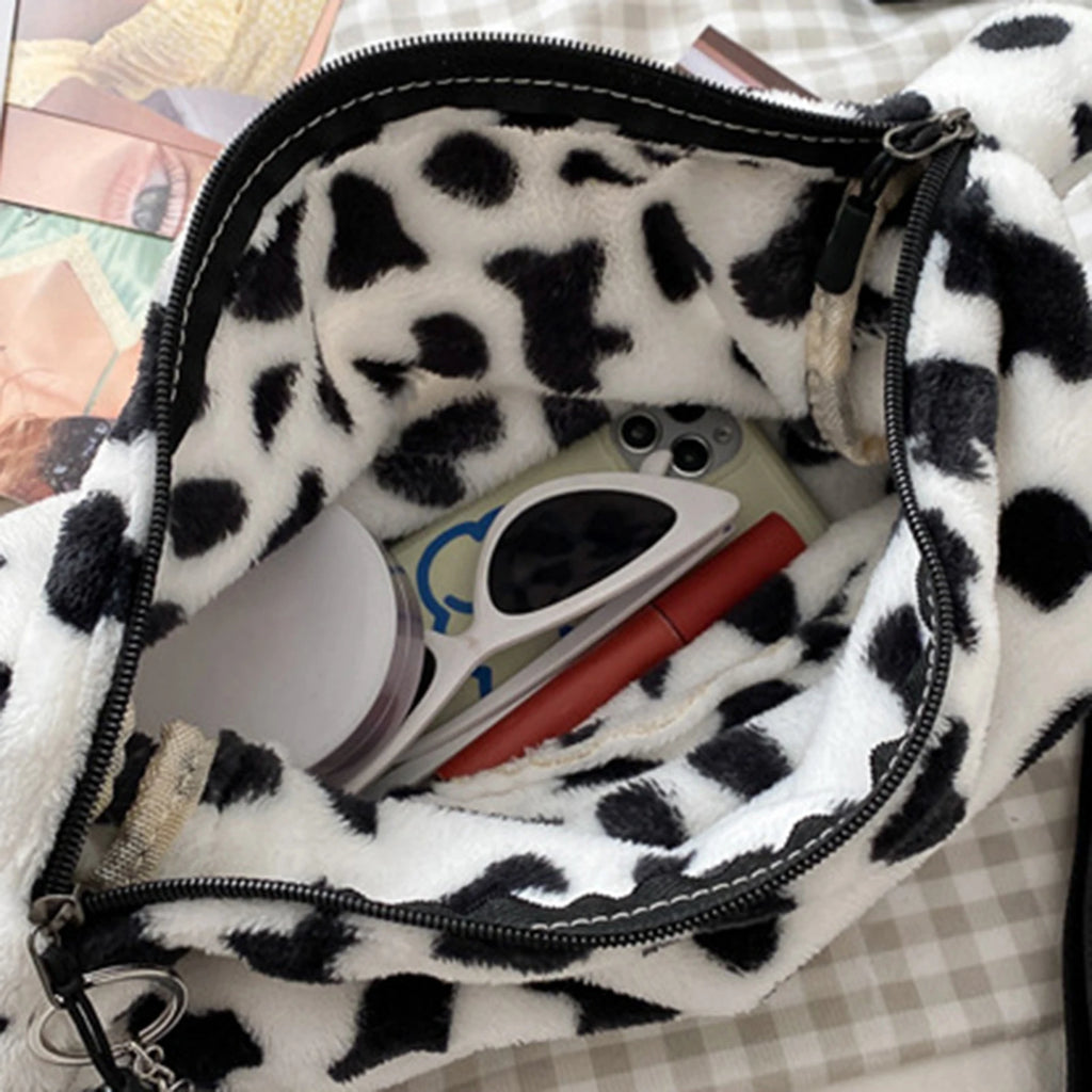 This stylish shoulder bag features a fun cow pattern design and offers a large capacity for all your essentials. The soft plush material and secure zipper closure make it a practical and fashionable choice for everyday use.