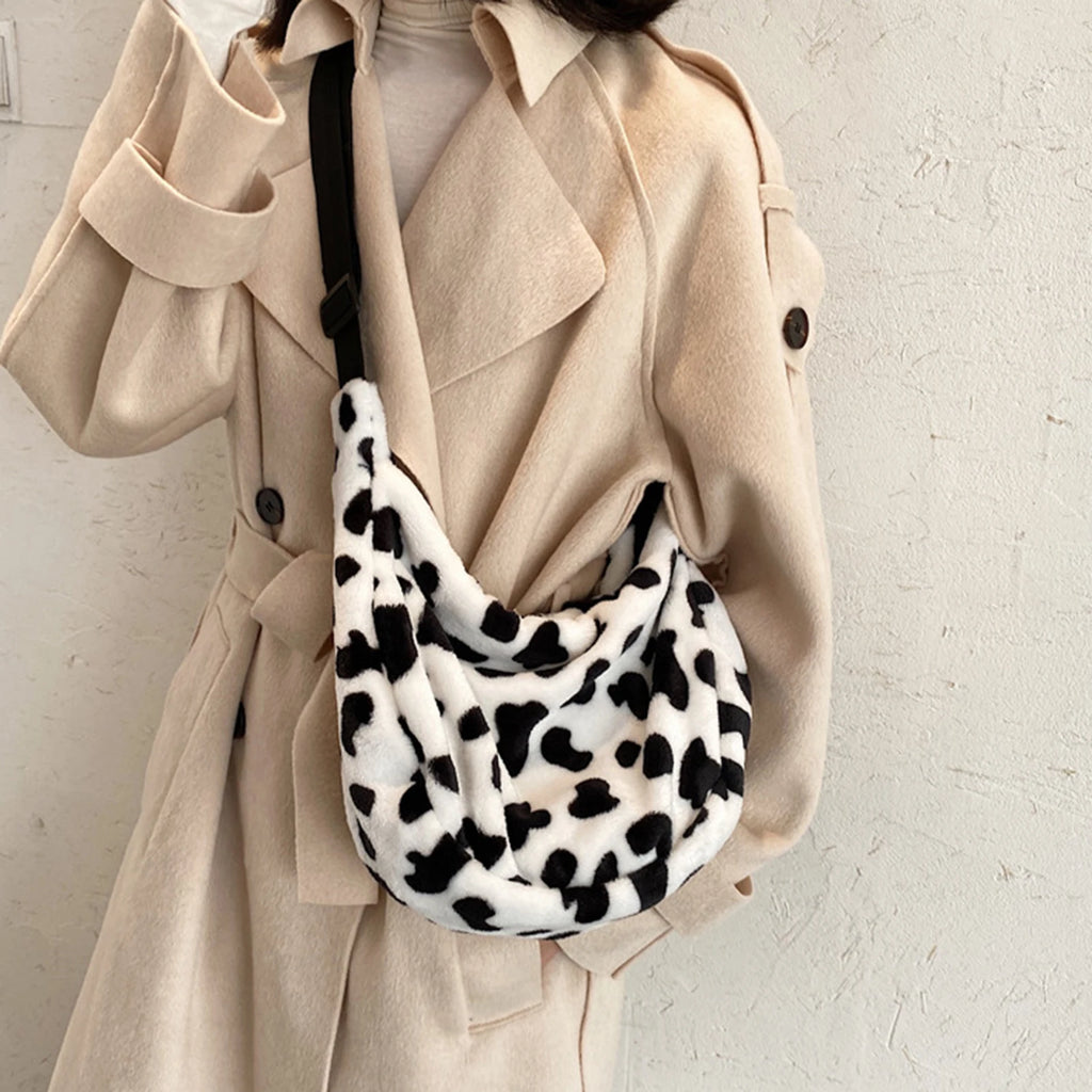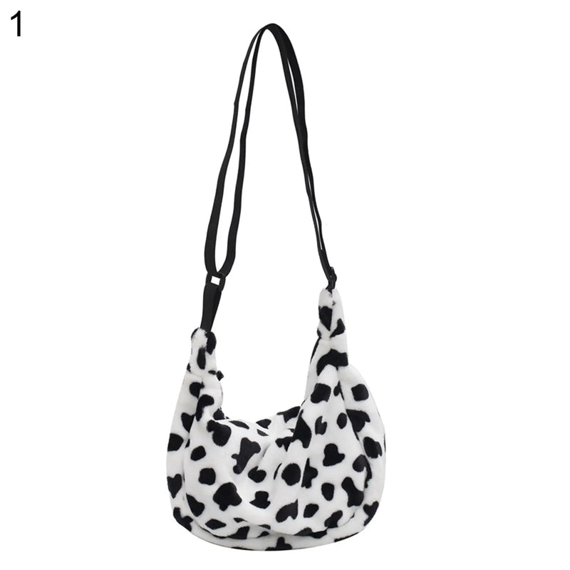 Women Cow Pattern Shoulder Bag Plush Crossbody Handbag