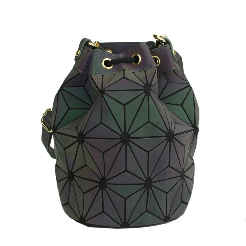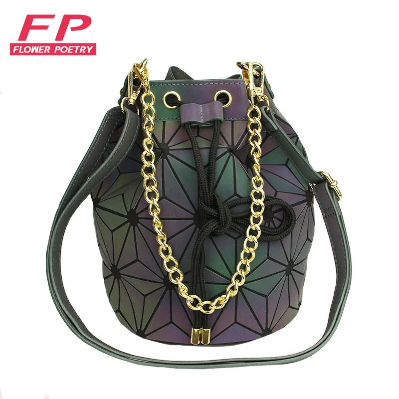 This trendy bucket bag features a geometric plaid design, drawstring closure, and a chain strap. It's perfect for casual outings and adds a touch of style to any outfit.