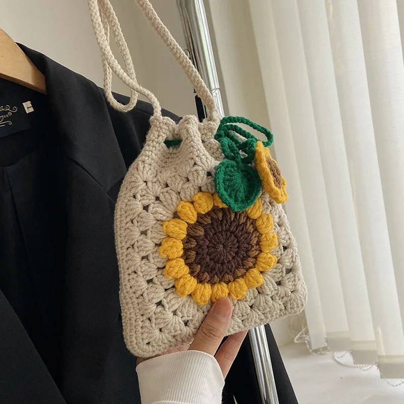 Women Floral Weaving Shoulder Bag Hand Crochet Bucket Bag