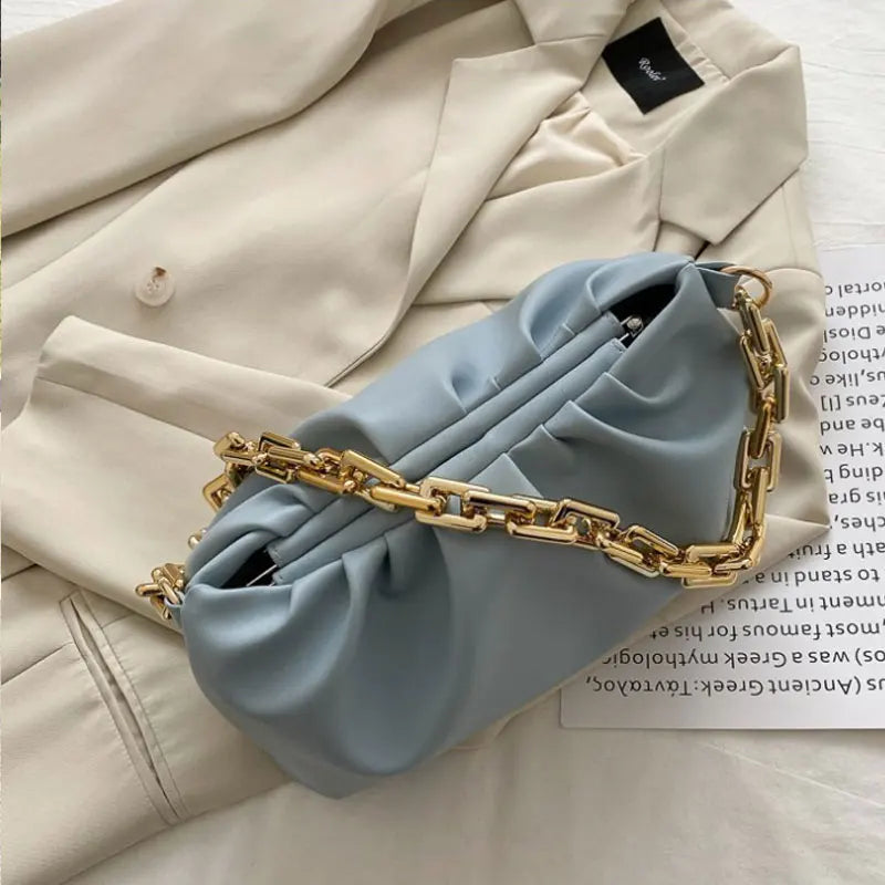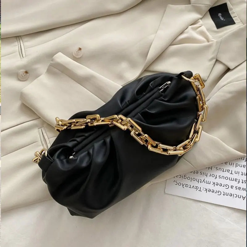Description:Elevate your style with this chic leather handbag featuring a high thick metal chain design. Perfect for adding a touch of sophistication to any outfit.Features: Made of high-quality leather material Features a unique cloud dumplings design Comes with a thick metal chain strap for a trendy look Spacious interior to...
