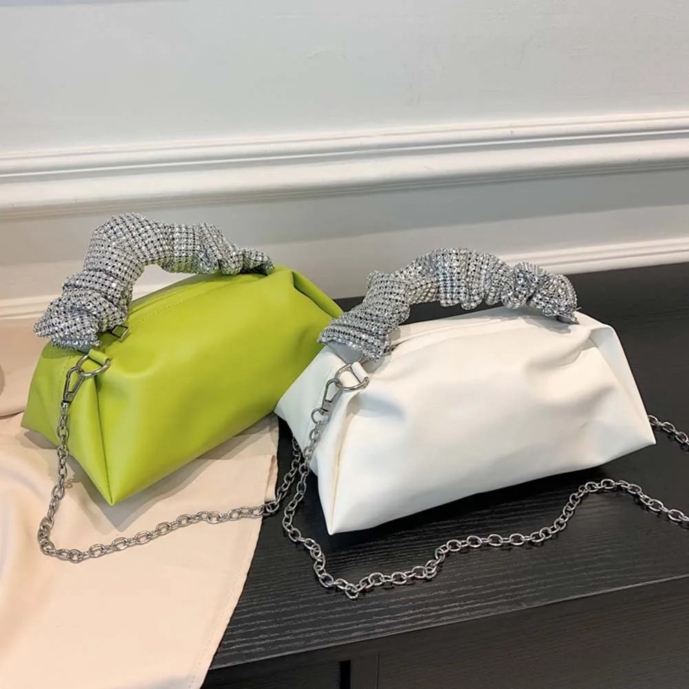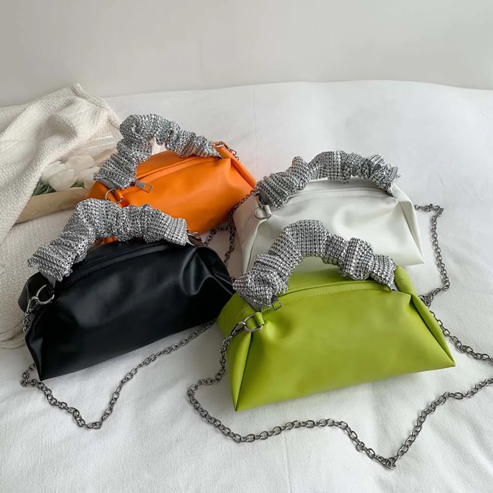 Elevate your style with this fashionable PU leather handbag featuring pleated cloud shoulder design and rhinestones decoration. Perfect for any occasion.