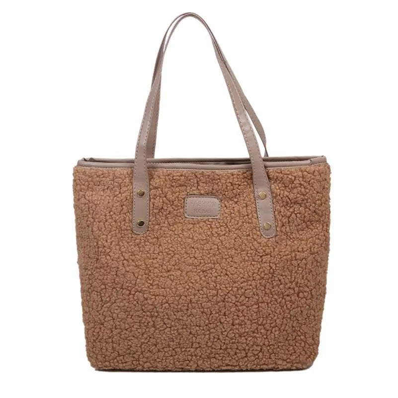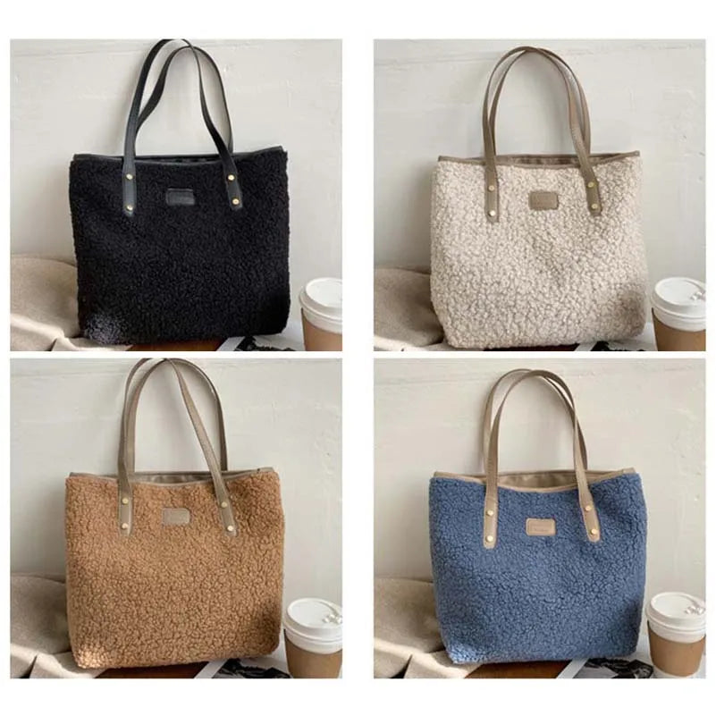 Stay cozy and stylish this winter with this plush faux lamb wool tote bag. Perfect for carrying all your essentials with a large capacity and a warm touch.