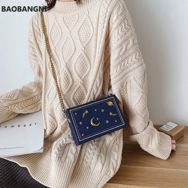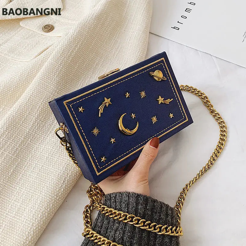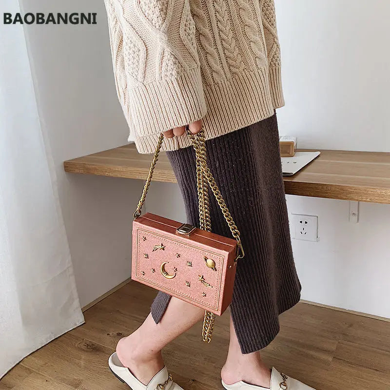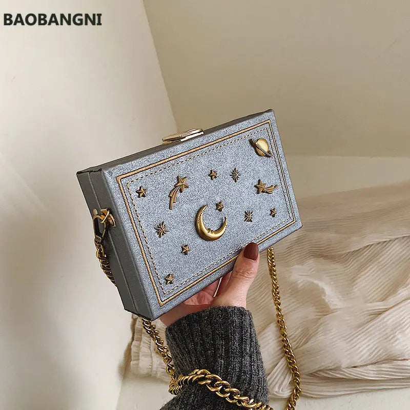 This small box shape shoulder bag is made of high-quality PU leather and features a stylish starry sky pattern. It comes with a chain strap for easy carrying and is perfect for girls and ladies.