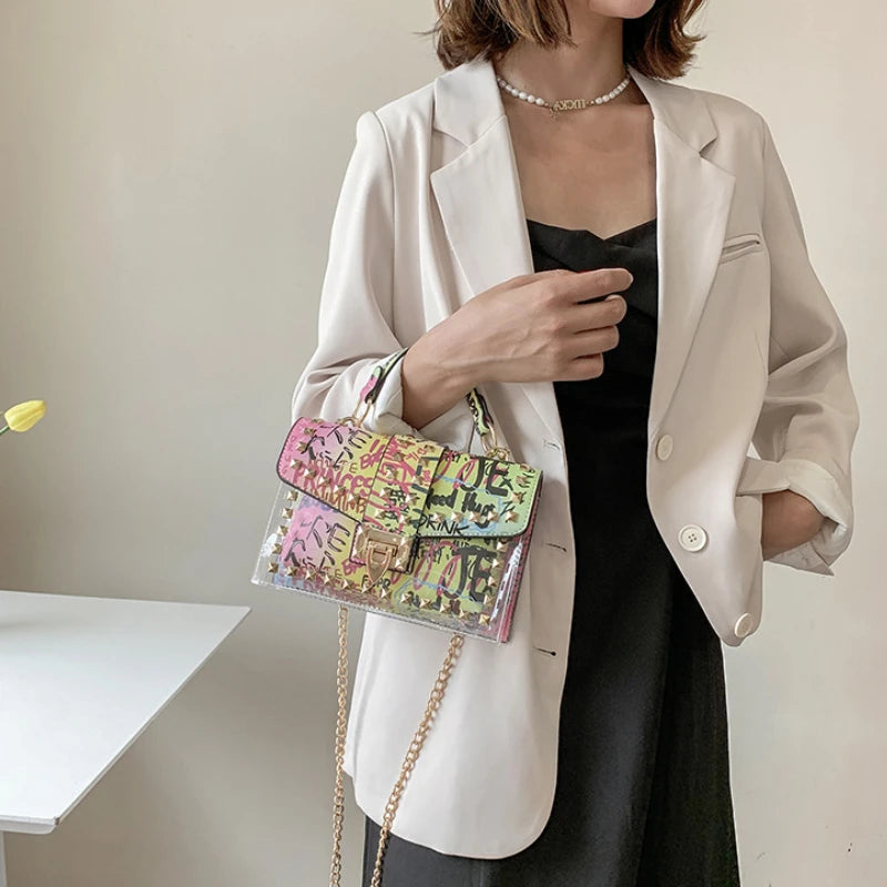 Description:Stay stylish with this trendy summer bag made of transparent PVC material adorned with graffiti design. It's perfect for carrying your essentials wherever you go.Features: Trendy PVC rivets handbag for women Clear design with graffiti print Compact size ideal for small items Versatile shoulder or messenger bag Perfect for summer...