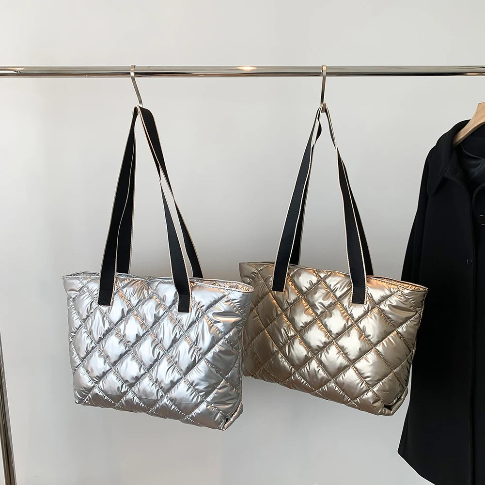Stay stylish and cozy with this winter shoulder bag featuring a rhombic lattice quilted design. Made of cotton padded material, this handbag is perfect for casual outings and shopping trips.