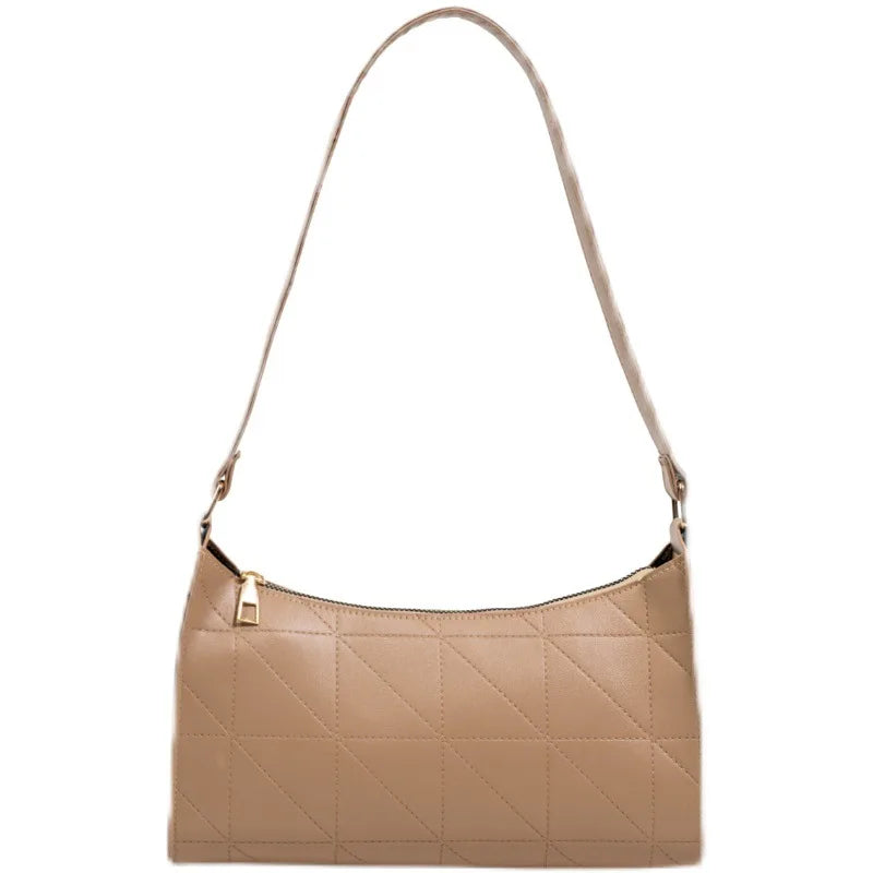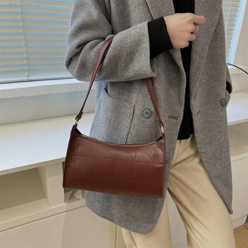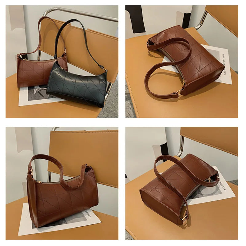 Elegant and functional women's shoulder bag made of high-quality PU leather with a beautiful lattice design and embroidered thread accents. Features a convenient zipper closure and a unique crescent shape.
