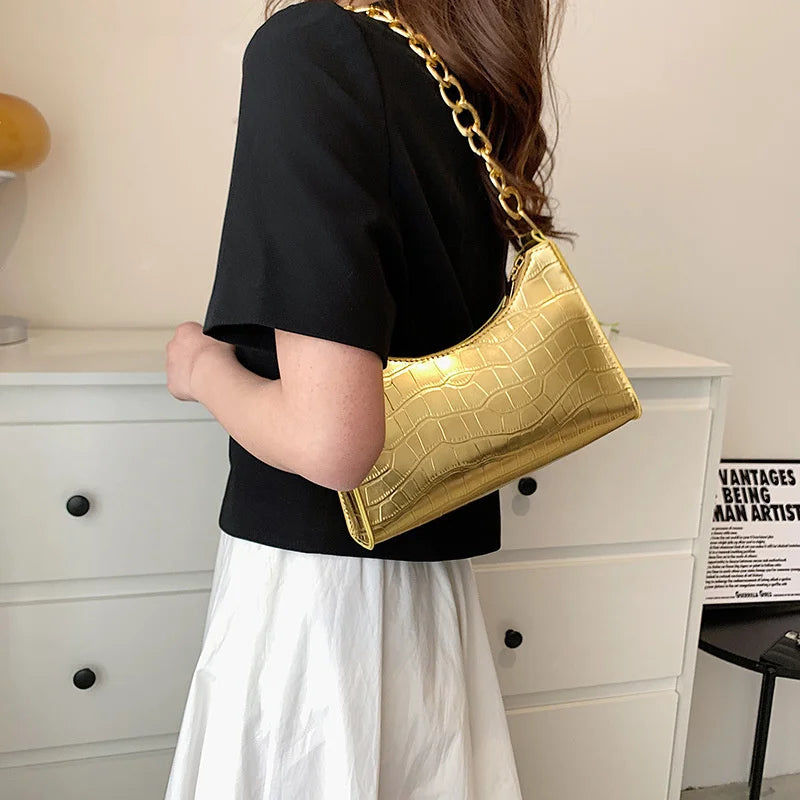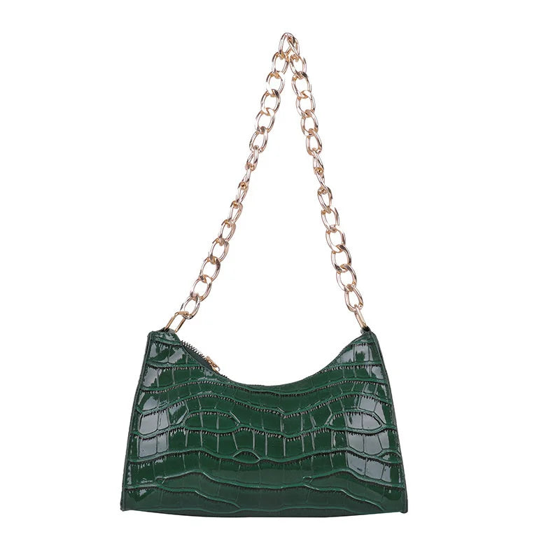 - Features a chain shoulder strap