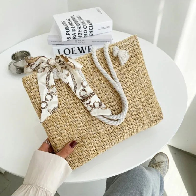 Get ready for summer with this wild casual straw shoulder bag that features a large capacity satchel design. The bag comes with a silk scarf for added style.