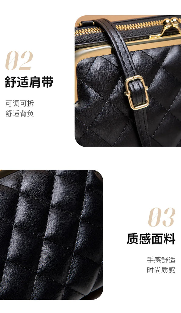 Stay stylish and organized with this long double-layer wallet bag featuring a mobile phone pocket, clip lock closure, and a trendy rhombus design. Perfect for carrying essentials on the go.