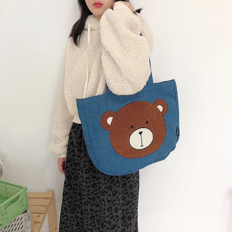 This denim shoulder bag for women features an embroidered bear design and offers a large capacity. Perfect for casual outings, shopping trips, and everyday use.