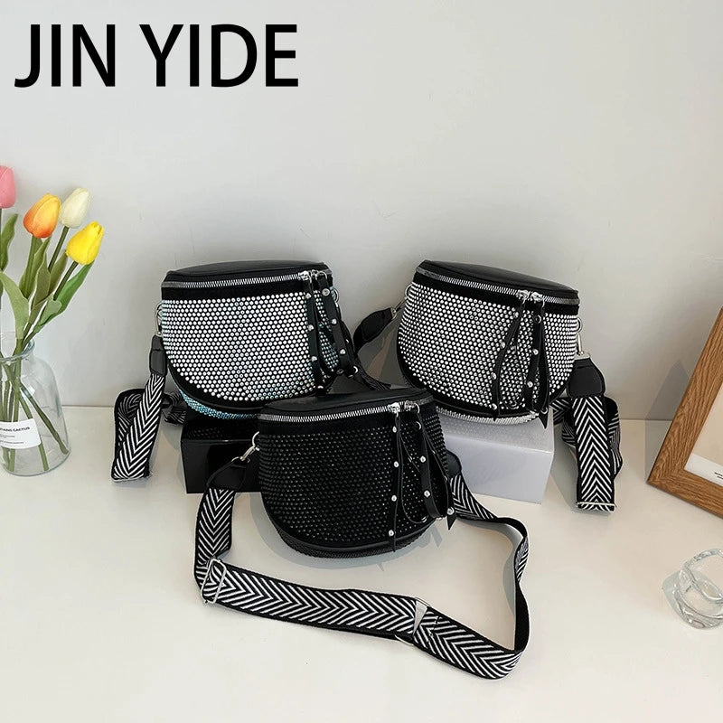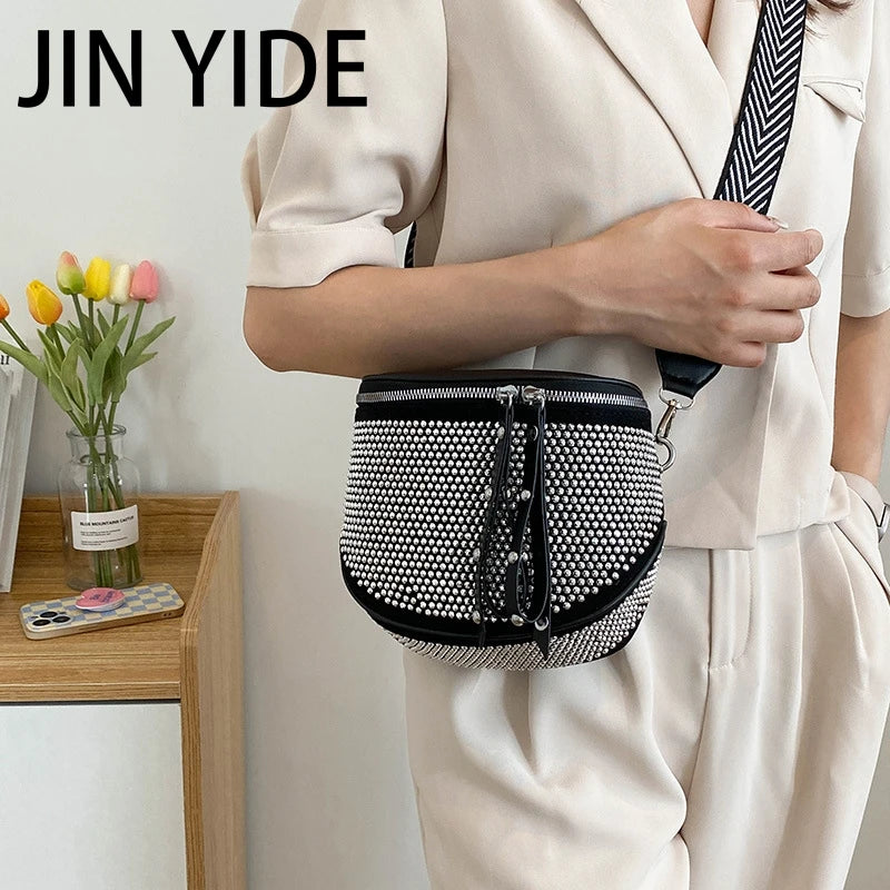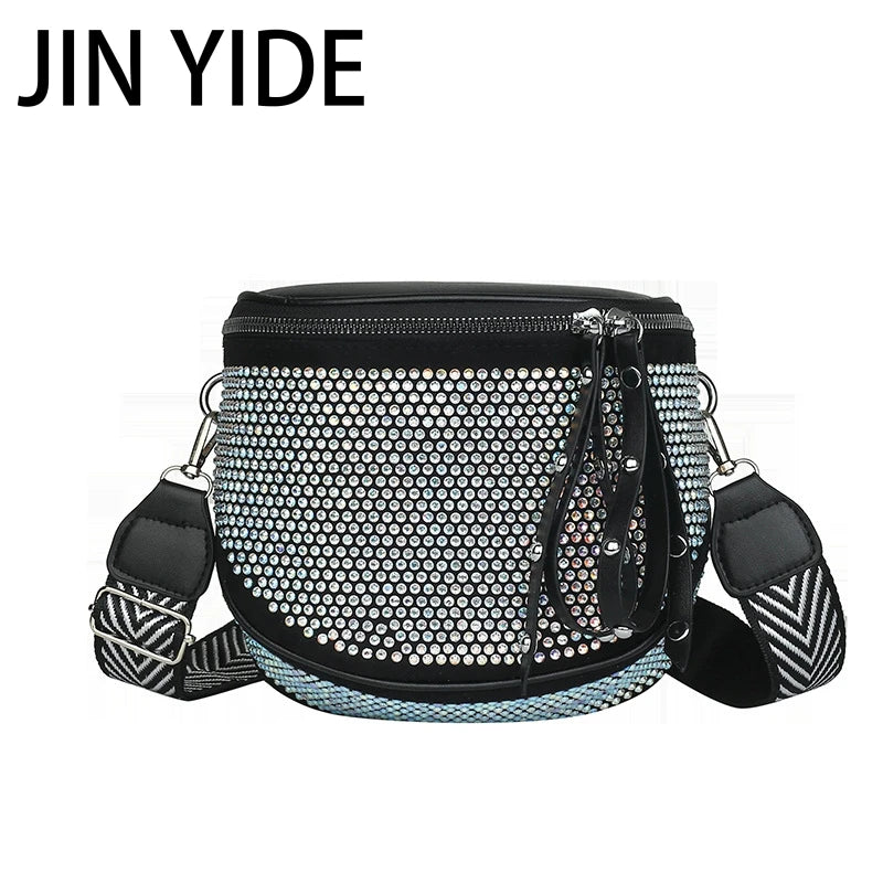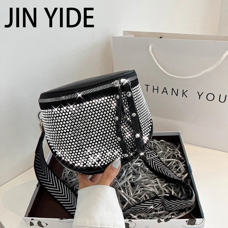 This stylish bag features a wide strap and is adorned with rhinestones, making it a versatile accessory for any occasion.