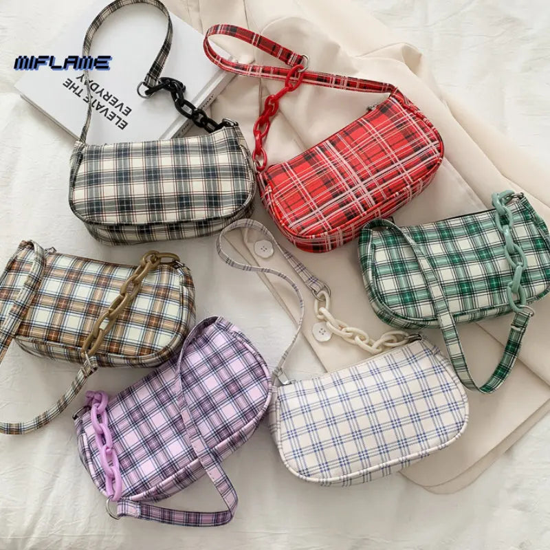- Retro plaid shoulder bag with chain strap
