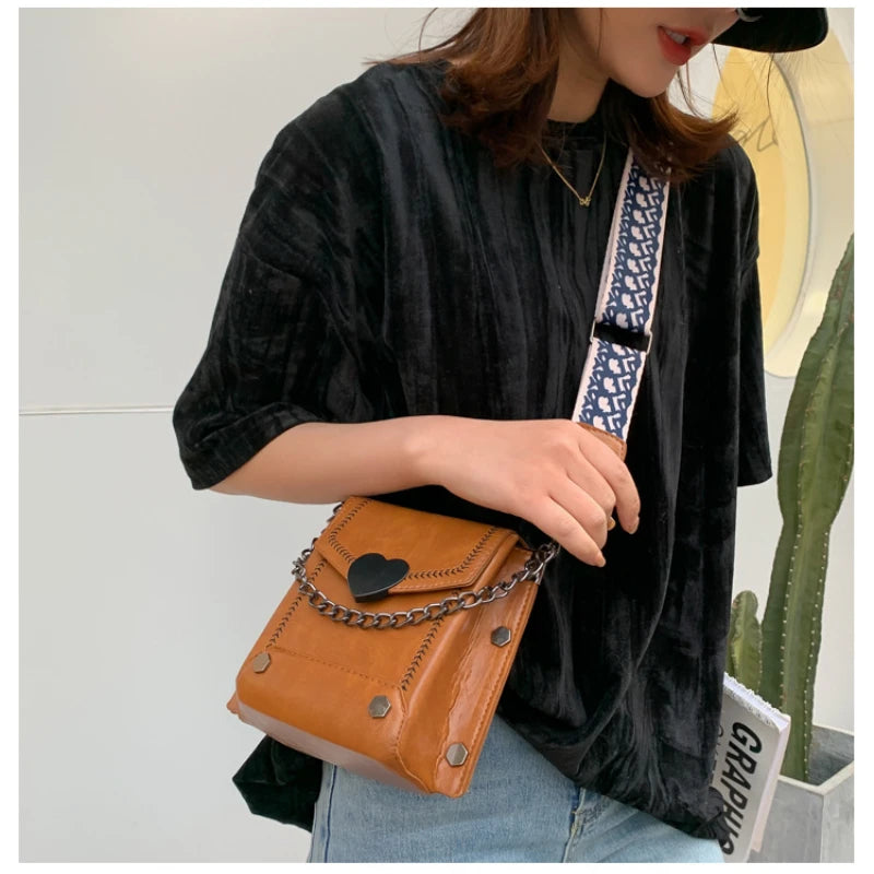 This women's handbag features a heart-shaped lock design, made of high-quality PU leather, ideal for a stylish and functional crossbody bag.