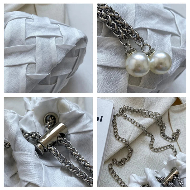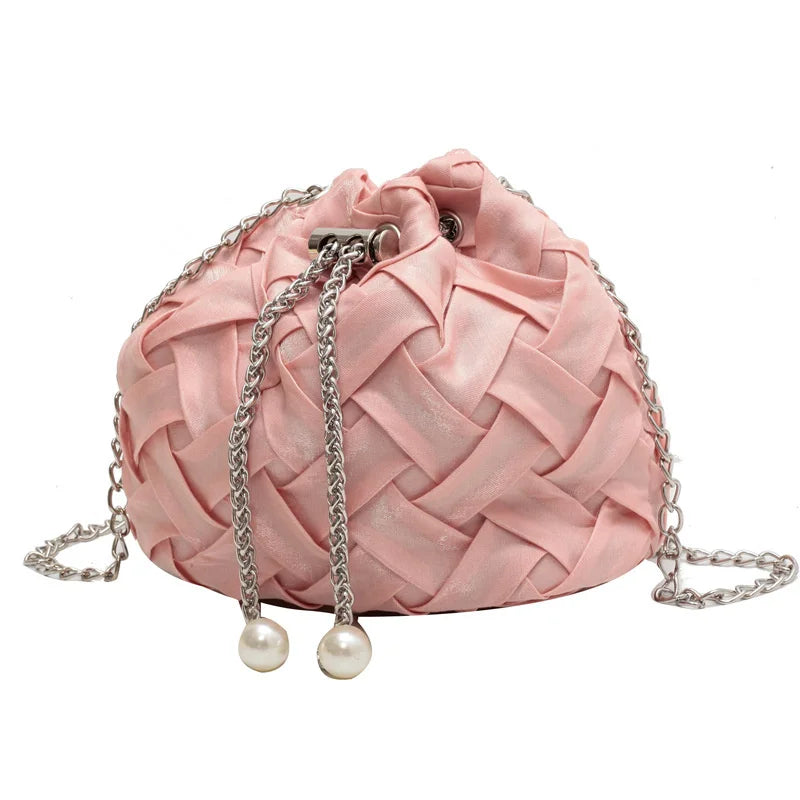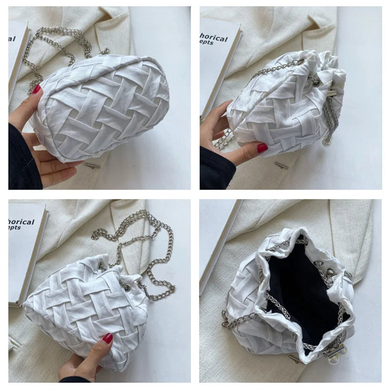 This stylish shoulder bag is crafted from high-quality PU leather with a unique weaving design. It features a bucket shape and comes with elegant chains for a trendy look.
