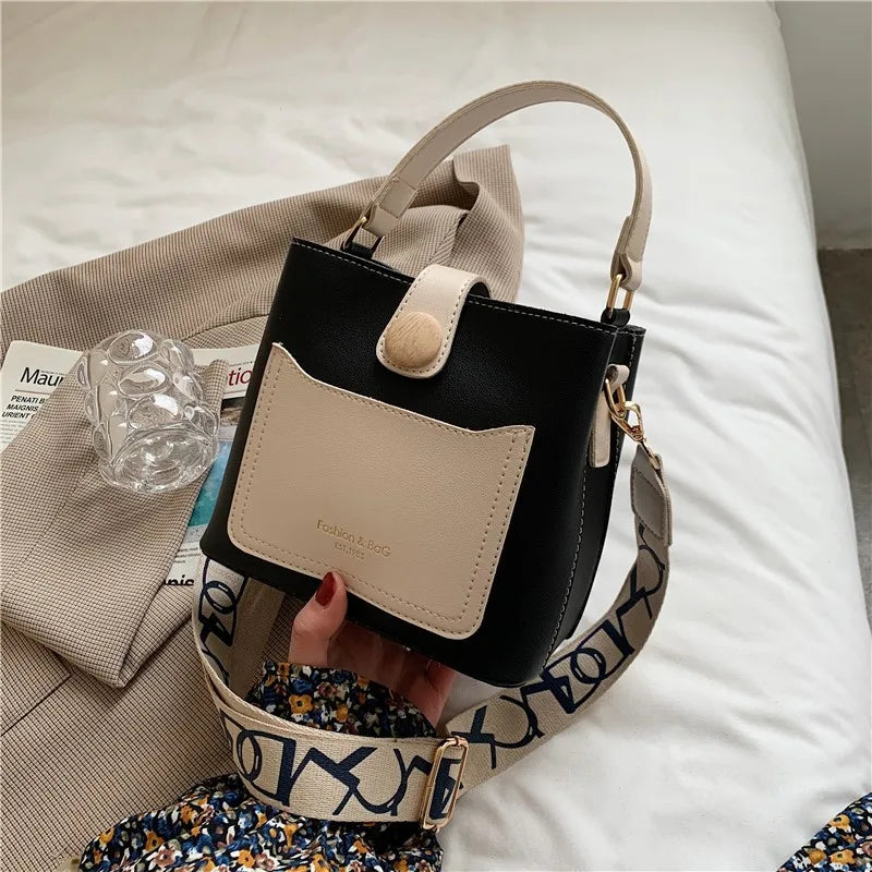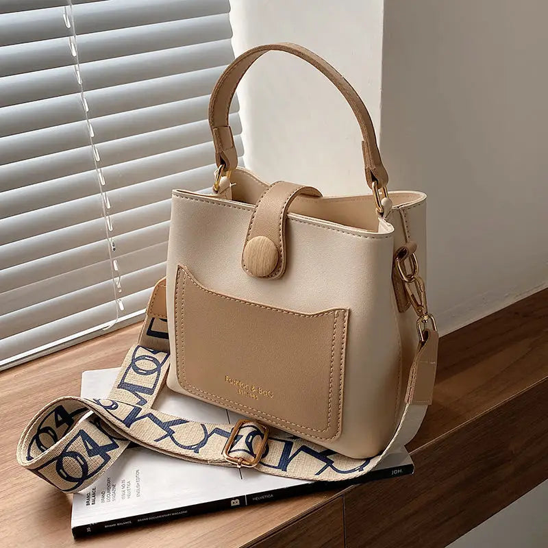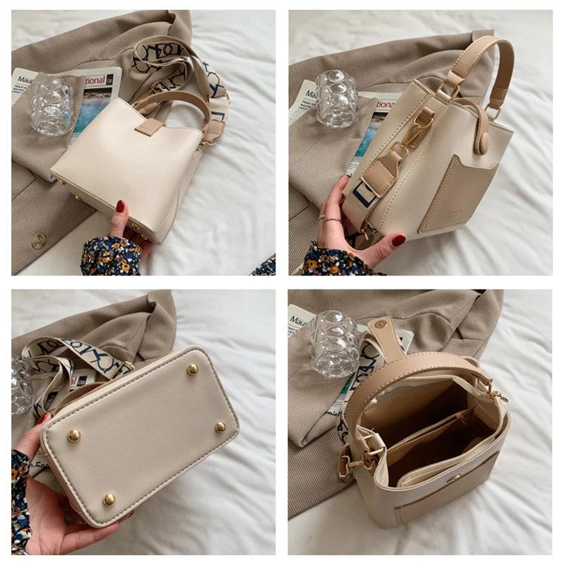 Women's PU Leather Shoulder Bucket Bags Small Handbags Wide Strap Crossbody Bags